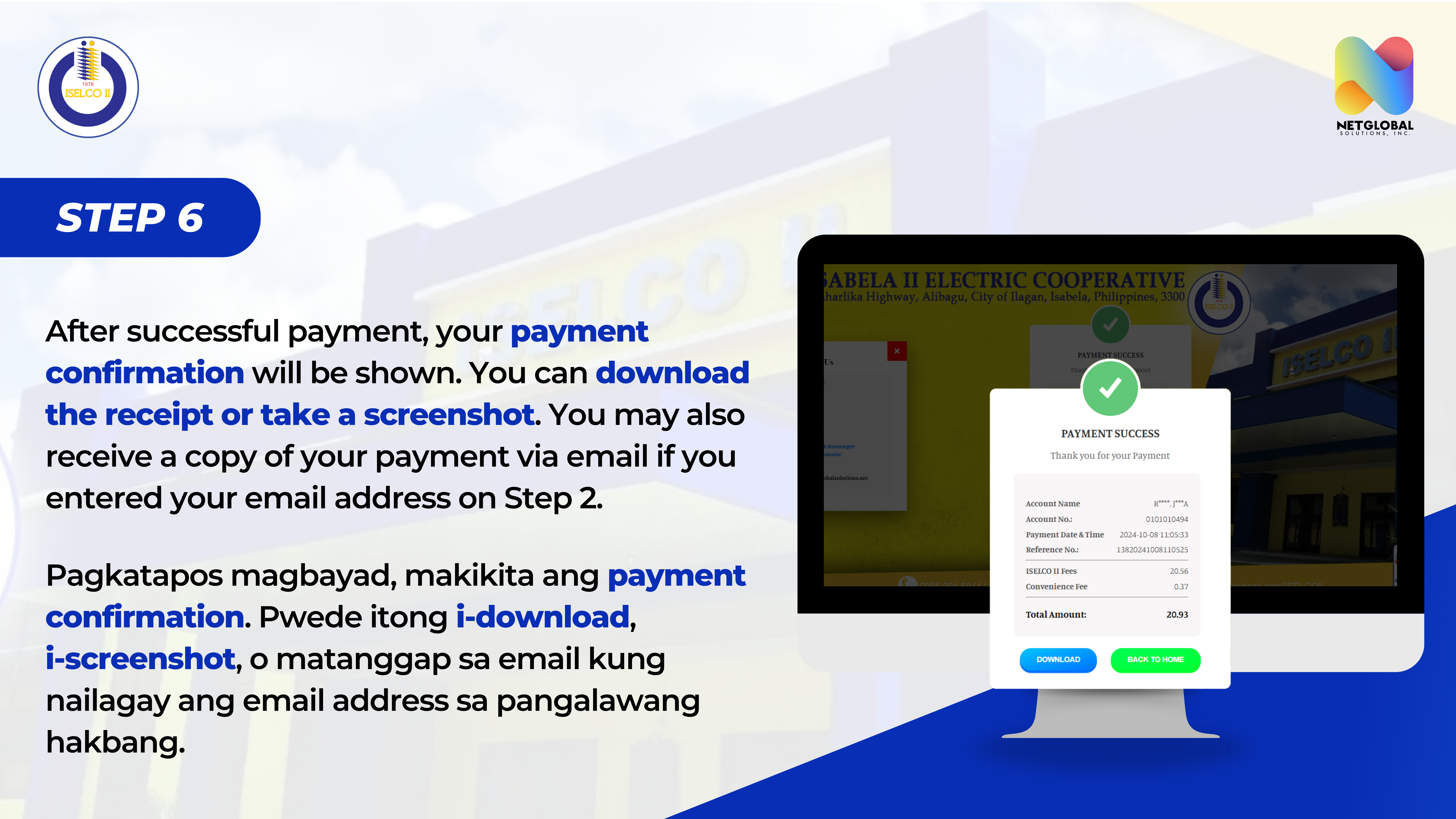 Maaari kang tumawag o mag-email sa aming Customer service para mag-request ng hard copy ng iyong ISELCO II na resibo. Ieendorso ng aming mga CSR ang request na ito sa ISELCO II at mag-a-update sila kapag available na ito para kunin sa pinakamalapit na branch ng ISELCO II.